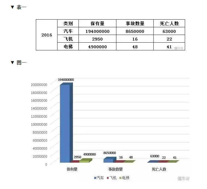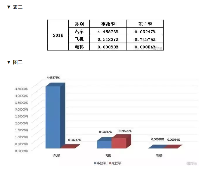 來看一組數(shù)據(jù),表一、表二、圖一、圖二是汽車、飛機(jī)、電梯三種交通工具的保有量、事故發(fā)生率、死亡率數(shù)據(jù)對比(僅以2016年為例)。 |